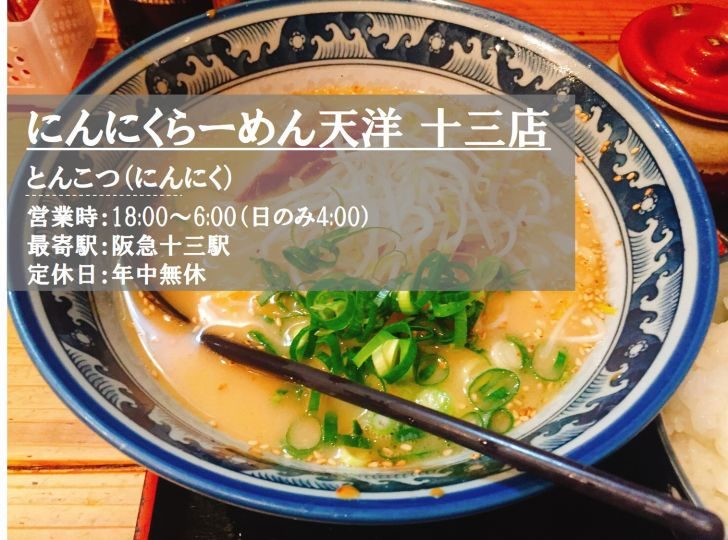 【大阪市淀川区】深夜でも食べられるラーメン店なら「にんにくラーメン天洋 十三店」がありますよ!
