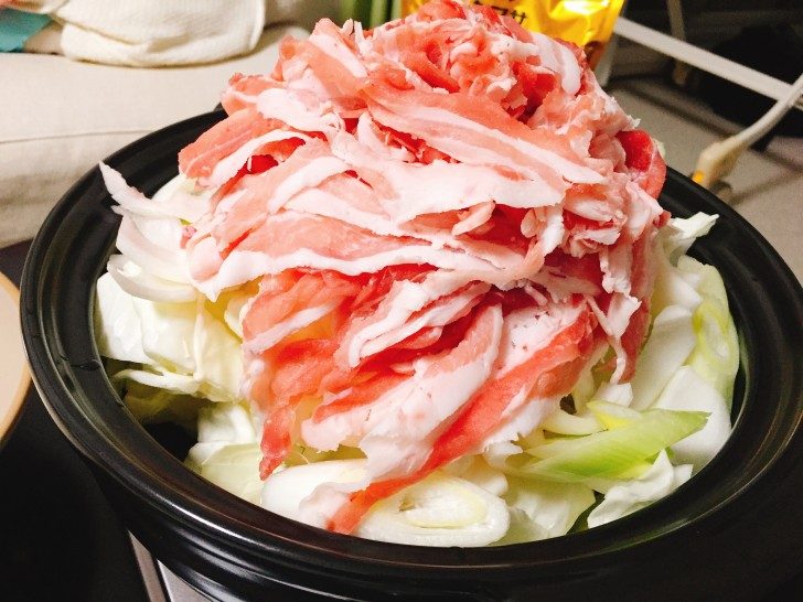 【ヤマサ】白みそ肉鍋つゆ。味噌と玉ねぎの絡みが抜群で、お鍋で肉タワーをやってみました!