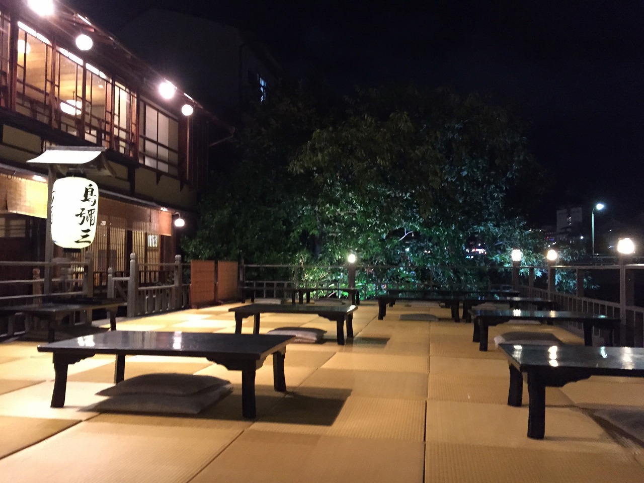 河原町に行くたびに鴨川の橋を渡っている時に良く横目で見ながら通っていたあの川床に、まさか自分が食事にいけるとは思えずテンションはMAXでしたね。男3人でしたが。。。