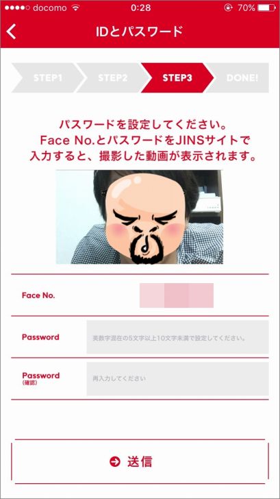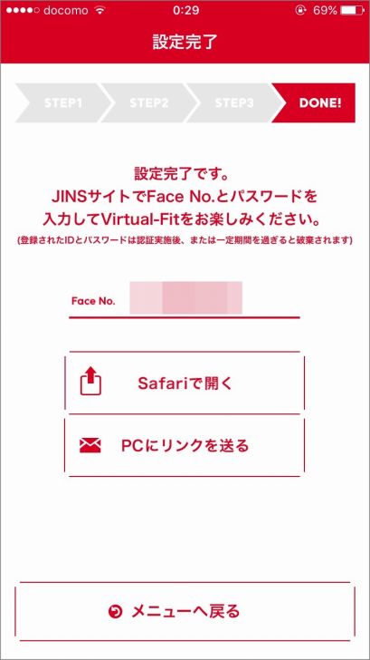 これはスマホで自分の顔を撮影した後に、発行されるID(Face No)とパスワードをJINSのサイトで入力すれば、自分の顔にメガネを合わせられるっていうアプリです。
