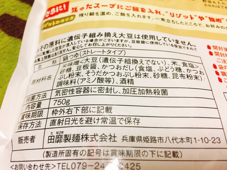 下に敷いたマットが緑で見にくいですが、田靡(たなびき)製麺株式会社という会社から販売されている元祖唐々本舗鍋スープです。