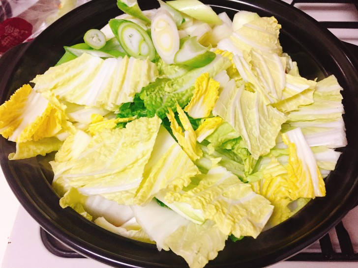今回の具材は簡素的に、白菜・ネギ・玉ねぎ・もち餃子・豚バラ肉でいきました。