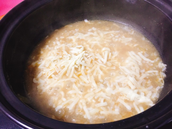 ▼一度煮立たせてチーズを振りかけます。