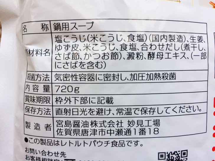 宮島醤油株式会社という会社から販売されている「糀鍋スープ生姜とゆず」という鍋スープです。