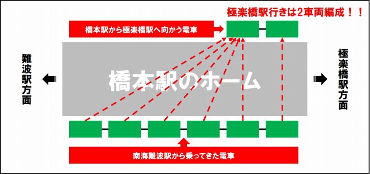 ここで大事なポイントは、難波発の電車は車両数が多いのに、橋本駅で乗り換える電車の車両数は圧倒的に少ないということです。