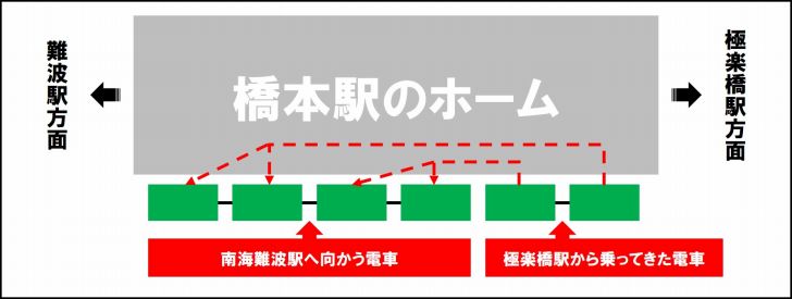 図で見てもらえれば分かるように、進行方向3両目より後ろの車両の人たちが乗り換えのために後ろからワーッと押し寄せます。