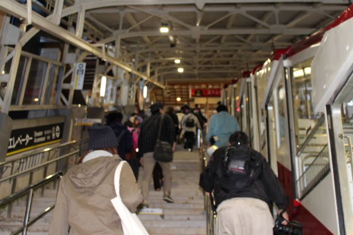 極楽橋駅に到着したら一気に少し足早にホームまで行けば、基本的には座れます。