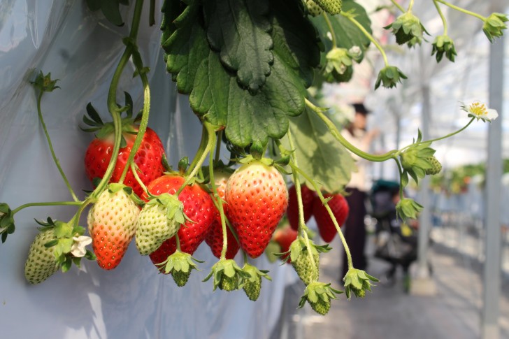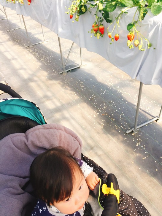 いちごに接触しないように気を付けないといけませんが、ベビーカーもハウス内に入れることが出来ました。