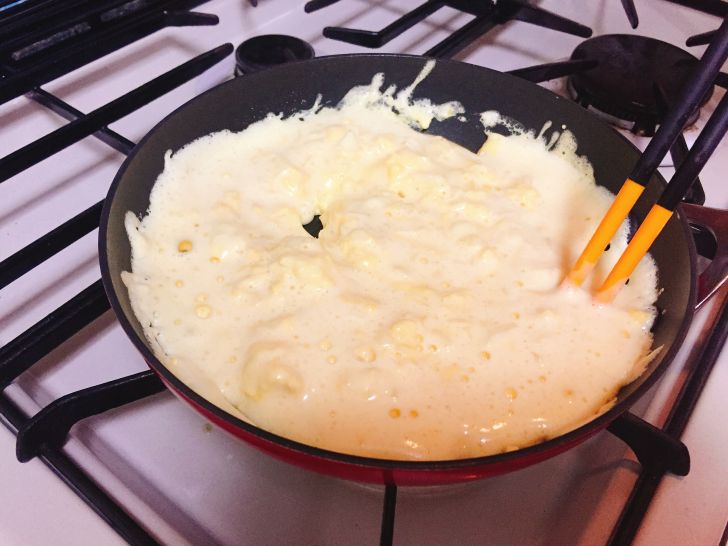 ▼半熟でかき混ぜて…