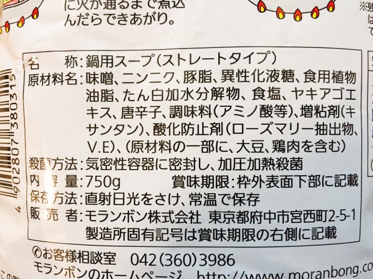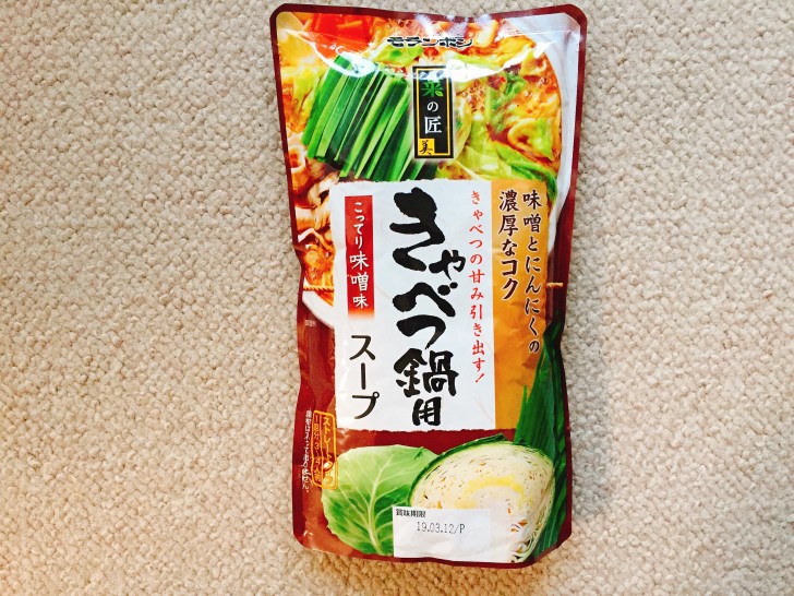それが【モランボン】という会社から発売されているきゃべつ鍋用スープ こってり味噌味です。