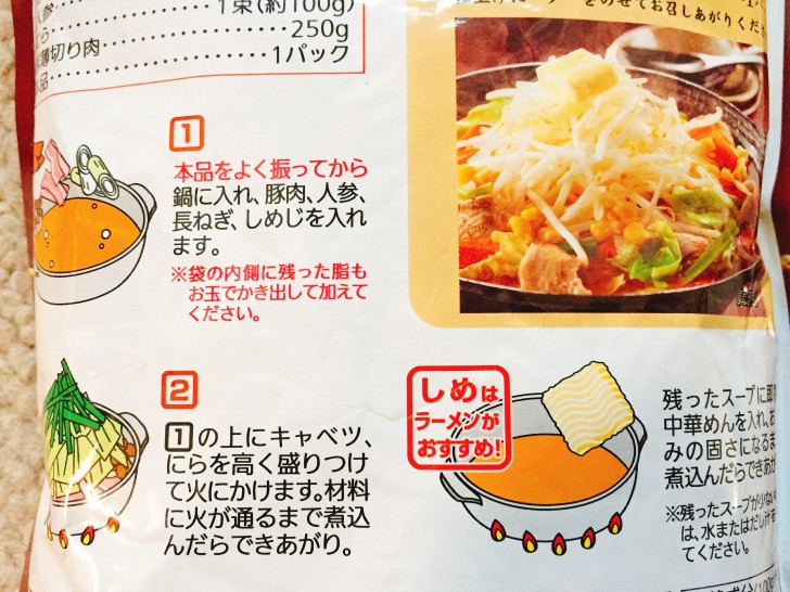 キャベツ鍋用スープと言いつつ、色味的にも完全にもつ鍋用スープの味噌味にそっくりです。
