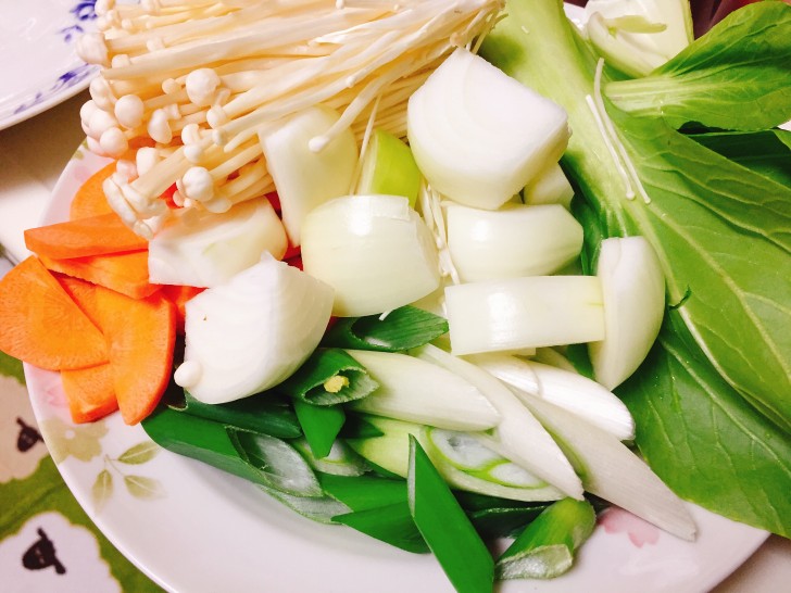 ▼スープを煮立たせて、チンゲン菜以外の野菜を先に投入しました。