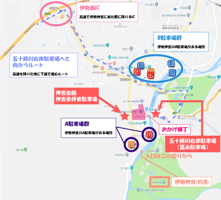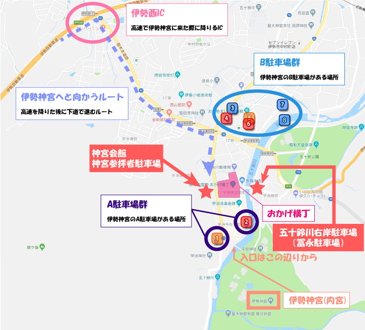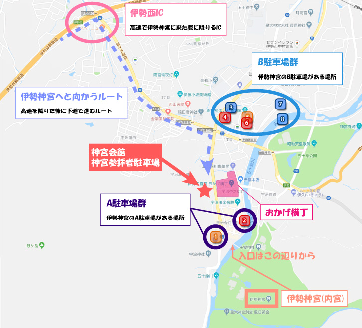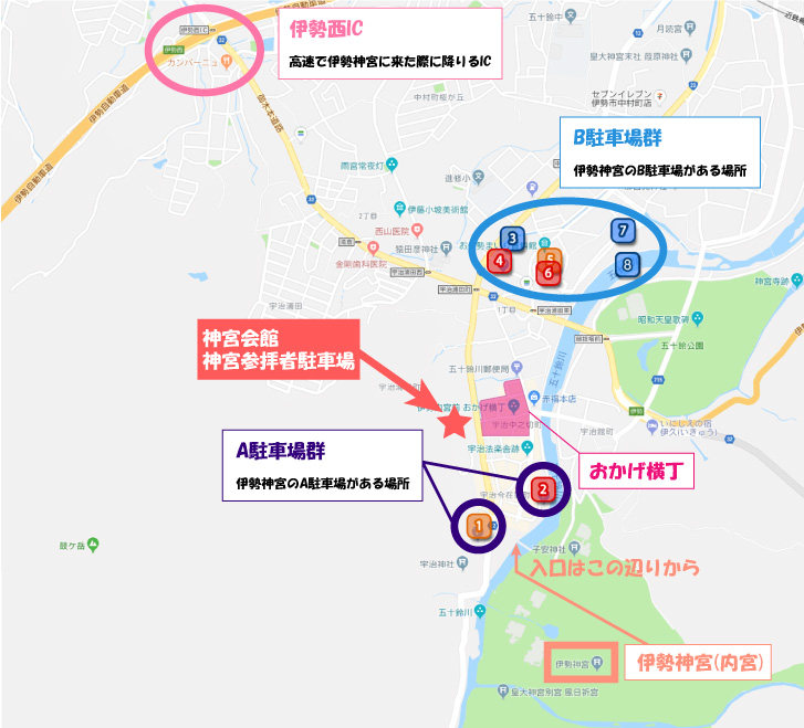 先程のMapに、伊勢神宮周辺にあるA駐車場やB駐車場、さらには伊勢神宮の場所までの解説を入れてみました。