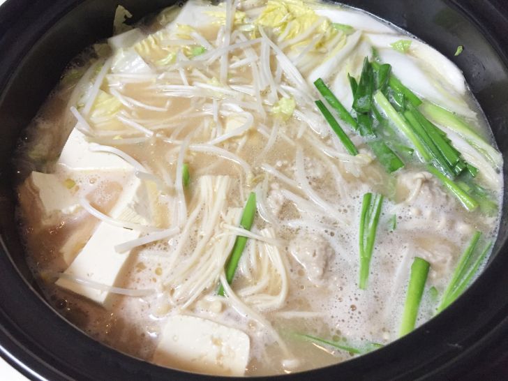 白菜・ネギ・もやし・つくねぐらいをちゃちゃっと入れたら、わずか10分程度で出来ます。