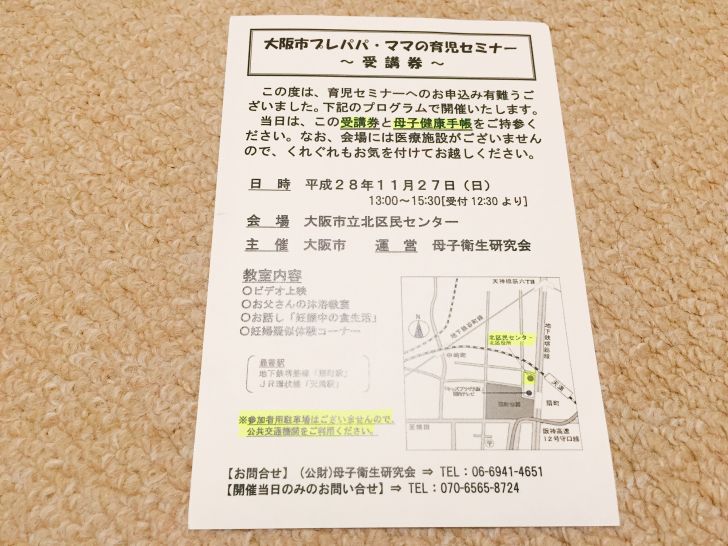 母子手帳をもらったりするために、区役所に色々手続きに行った時に「セミナーがあるから受講して下さいね!」みたいに案内されるものです。