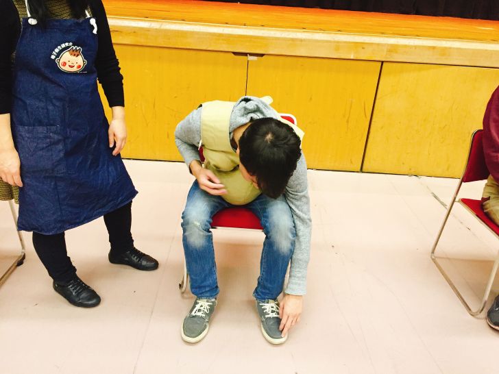 講義が終わった後は沐浴体験のはずでしたが、待ち時間があったので先に妊婦疑似体験をしてみました。