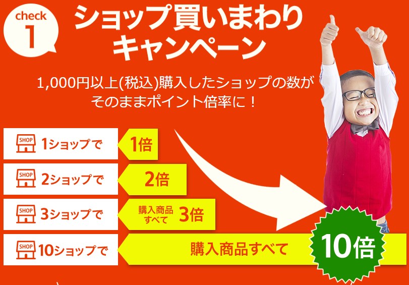 楽天市場で1,000円以上の購入をした店舗数だけ、ポイント還元率が上がっていくという仕組みです。