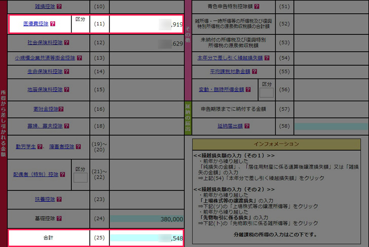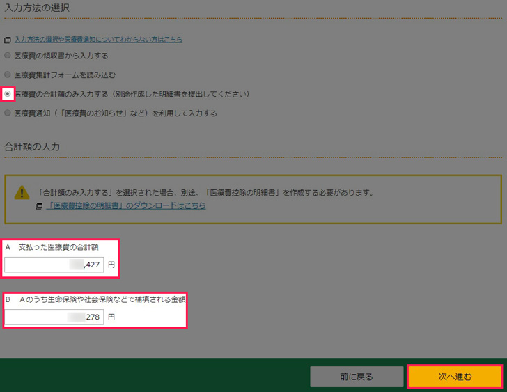 ▼「次へ進む」をクリックすると、医療費控除の項目に金額が反映され、合計も変わっているはずです。