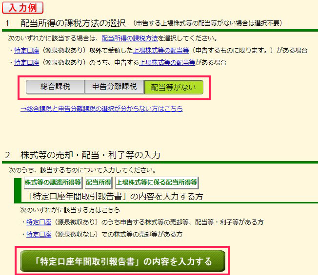 ▼配当所得の項目ですが、該当しなかったので「配当等がない」にチェックし、下部の「「特定口座年間取引報告書」の内容を入力する」をクリックします。