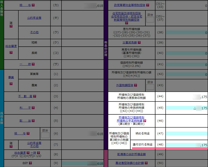 株の取引を入力する前までは「納める税金」に金額が入っていたものが、入力後は「還付される税金」の方に金額が入っています。