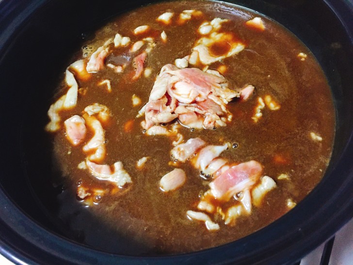 ▼スープが煮立ってきたので肉を投入します。
