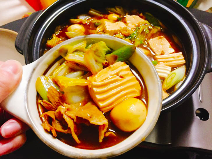 この鍋つゆは3~4人前と書かれてますが、我が家ではいつも夫婦二人で食べきっています。