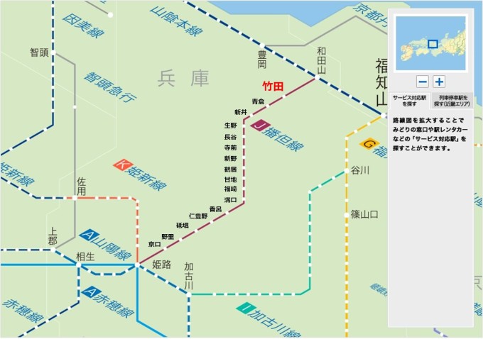 ▼以下は、竹田駅を通っているJR播但線の路線図です。