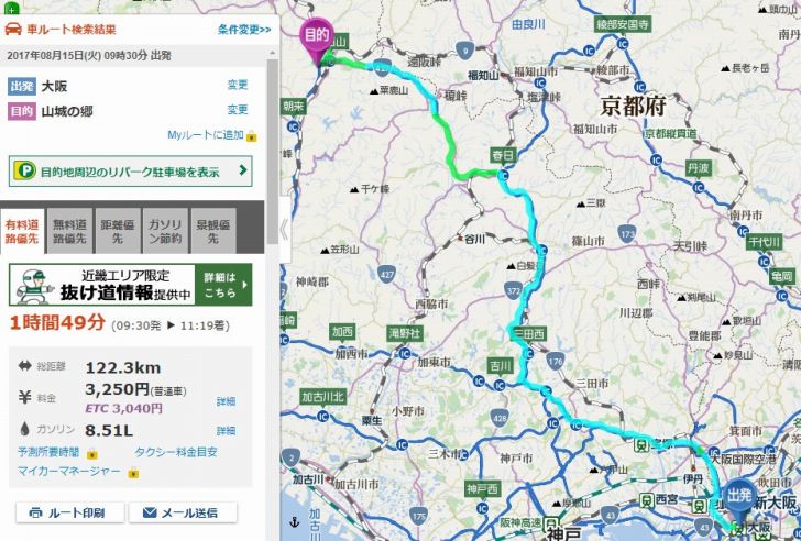 大阪駅からの場合、【阪神高速⇒中国自動車道⇒舞鶴若狭自動車道⇒遠阪トンネル有料道路】を経由して、山城の郷へと向かうルートになります。(NAVITIME調べ)