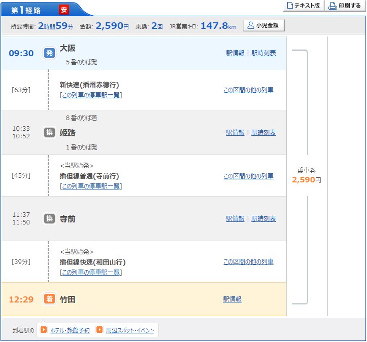 大阪駅からは、特に有料列車を使わずに新快速などを乗り継いで竹田駅まで向かうルートです。