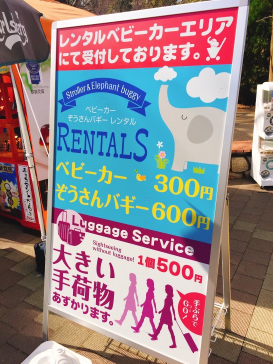 我が家はベビーカーの足の部分に強引に荷物を押し込んでますが、園内をゆっくり自由に回るなら、手荷物預かりを使うのも手かもしれません。