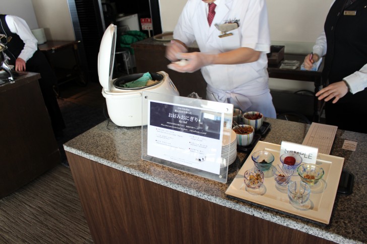 ▼オムレツの隣におにぎりを作ってくれるスペースがあります。