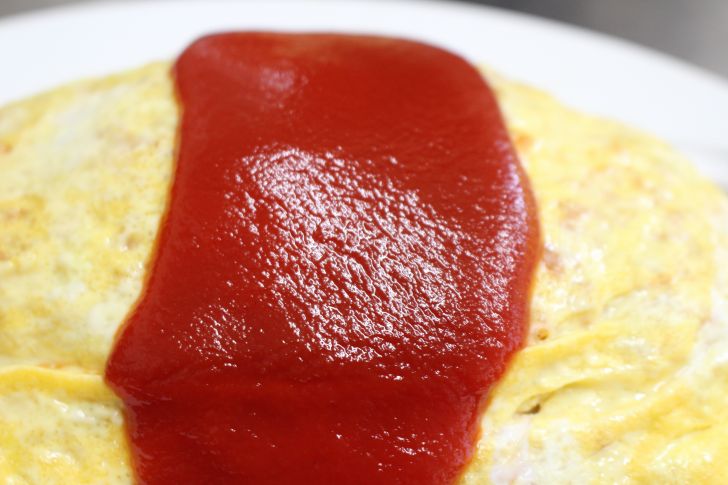 上に乗っているケチャップがたっぷりな上に、中のチキンライスにもケチャップがたっぷりだったので、かなり重たくなりました。